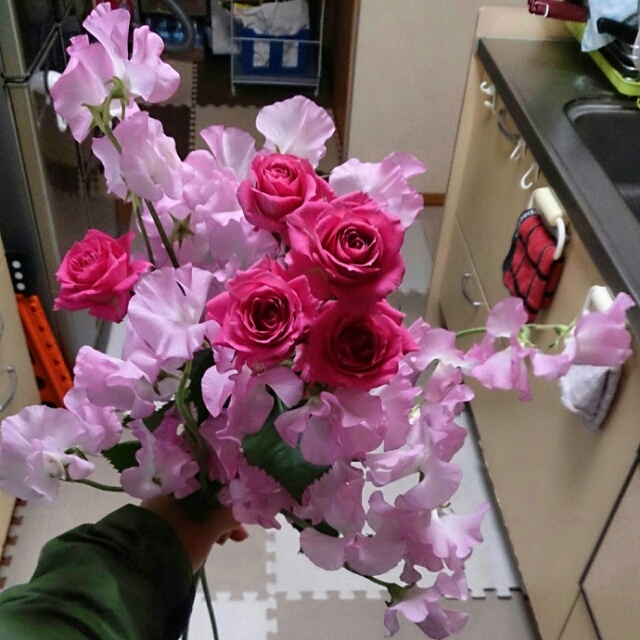 姉ちゃんの大好きなスィトピィー14本の中に1ポンのスプレーバラ、これからの1年です、この一年は更にたくさんの枝を伸ばして・・・ケーキは姉ちゃんのリクエストでお気にのお店のをいろいろ食べたいってことで今年はホールではありません(^^)b