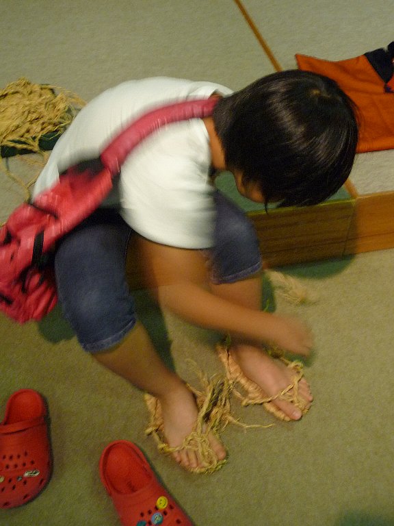 草鞋ってどう履くんでしょう?あ~、弟は獅子舞で履いてるから知ってるなぁ、今度ばぁちゃんち行ったらおじちゃんに聞いてみな。