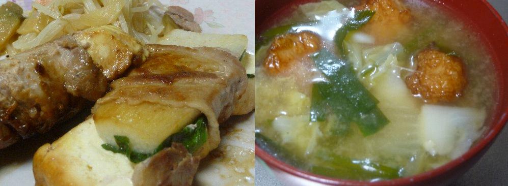 今日は木綿豆腐に長いもと紫蘇を乗っけて黒部名水ポークのばら肉で巻いて焼き焼き、それにもやしとザーサイとタラコをいためたのを添えて!