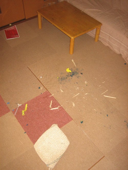 これはテレビ台の中に鎮座していた籐かごで、この青い物体は・・・前に姉ちゃんが紙粘土に絵の具を混ぜて作ったゴンベのミンチばらばら事件?!あ~残酷だぁ!(TwT。)