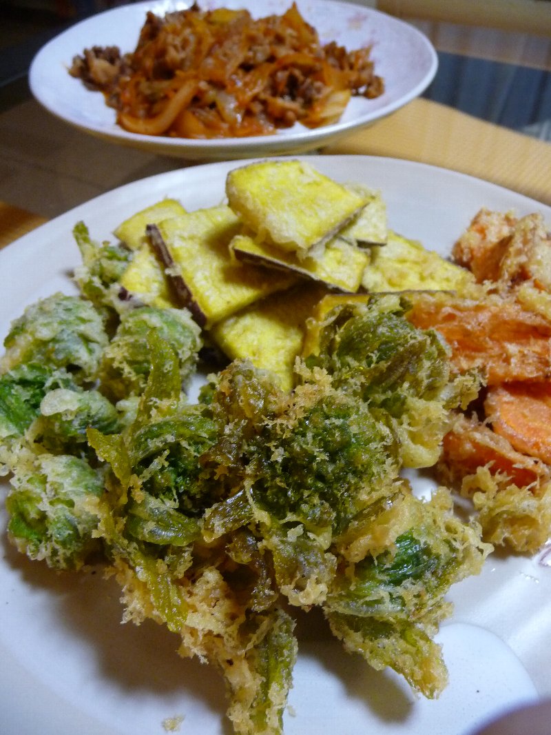 そんなわけでうちにあるサツマイモやニンジンと一緒に天ぷらにして、後は豚こまがあったから豚キムチ作って、豆腐ときのことたらこの味噌汁して、ホタテ缶で炊き込みご飯でもしたら充分?買い物行かなくっていいなぁ~。