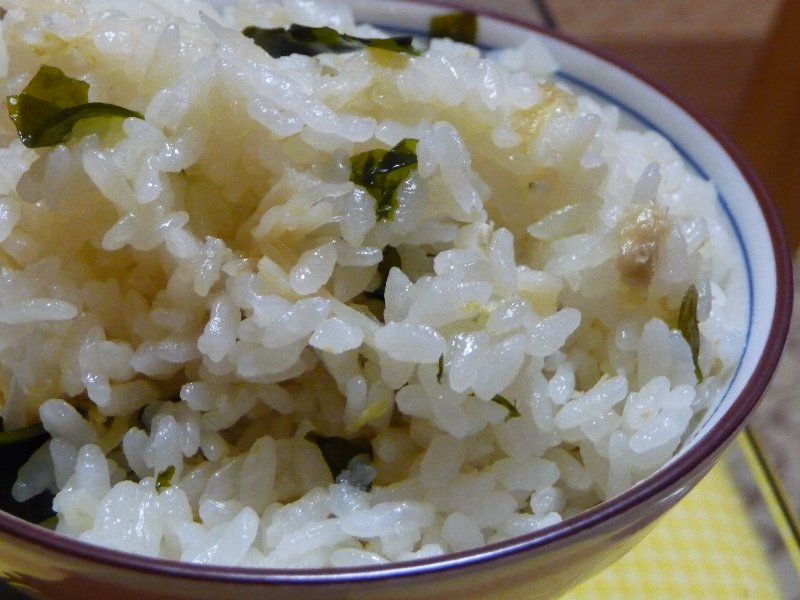 ホタテの炊き込みご飯、この間テレビで炊き込みご飯に乾燥ワカメをそのまま入れてってのやってみたんで入れてみました。