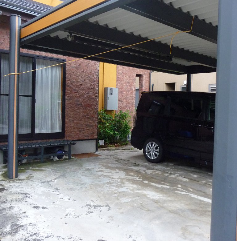いつもはガレージの4本の柱を利用してたんだけど道路側の柱だと道にがんがん出れて車来たら危ないし、何より樋のついている側の柱につないで前に樋壊されたこともあって