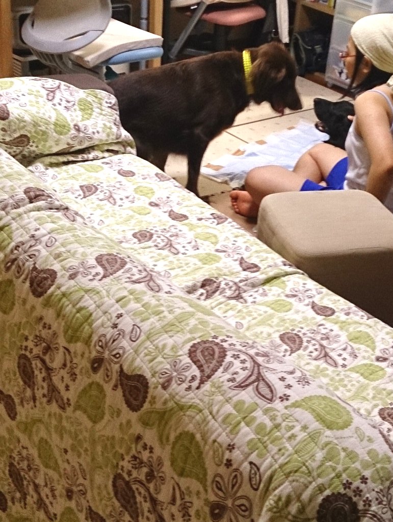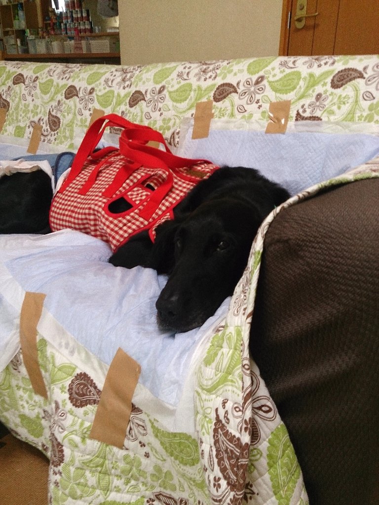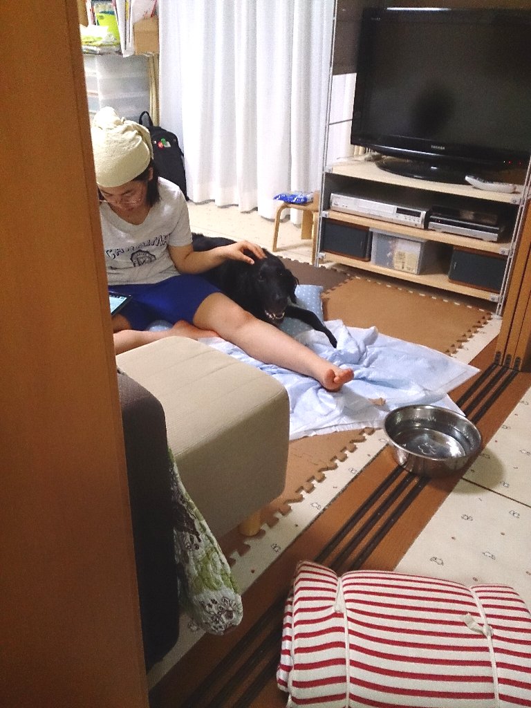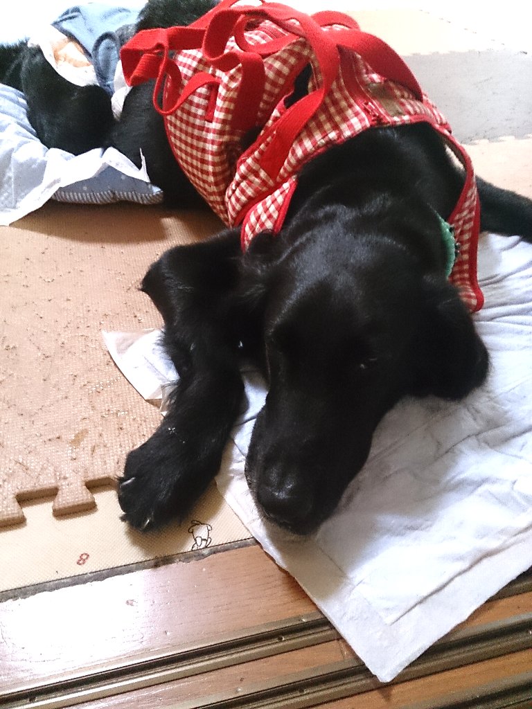 ここ何日か歩みがゆっくりだったのに我慢してたからしたかったんでしょうね、すごい軽快に小走りで10mちょい離れてる公園へ、で、おしっこ体制をとったかと思ったら崩れ落ちて伏せちゃって、果たしておしっこは出たのか疑問だったけどこれはダメだと何とか抱き上げようとするも脱力していて全く協力的でない大型犬推定27k、かたや同年齢の女性とは比較にならないくらい力持ちで足腰は強いはずのchababa(なんせ8kのフード3っかついで持って移動できるんですから ^^;)なのに抱き上げれない(><)