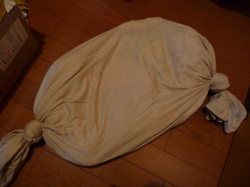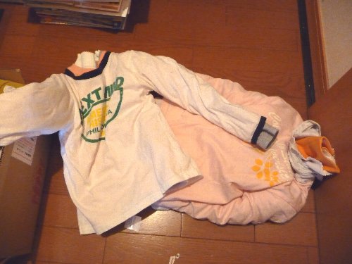 まず用意したのがねえちゃんの着れなくなった洋服で絵の具や墨がついて人にあげれないもの、それを重ね合わせたもの2ヶ。