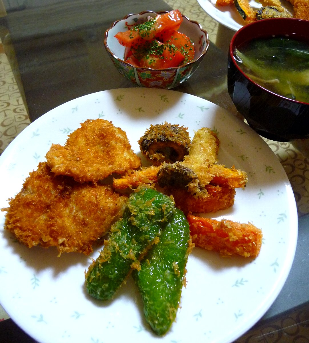 ホッケのほかは南瓜にシイタケに人参・ピーマン・エリンギのフライ、おうちで揚げるとさくさくで油っこくなぁ~い♪