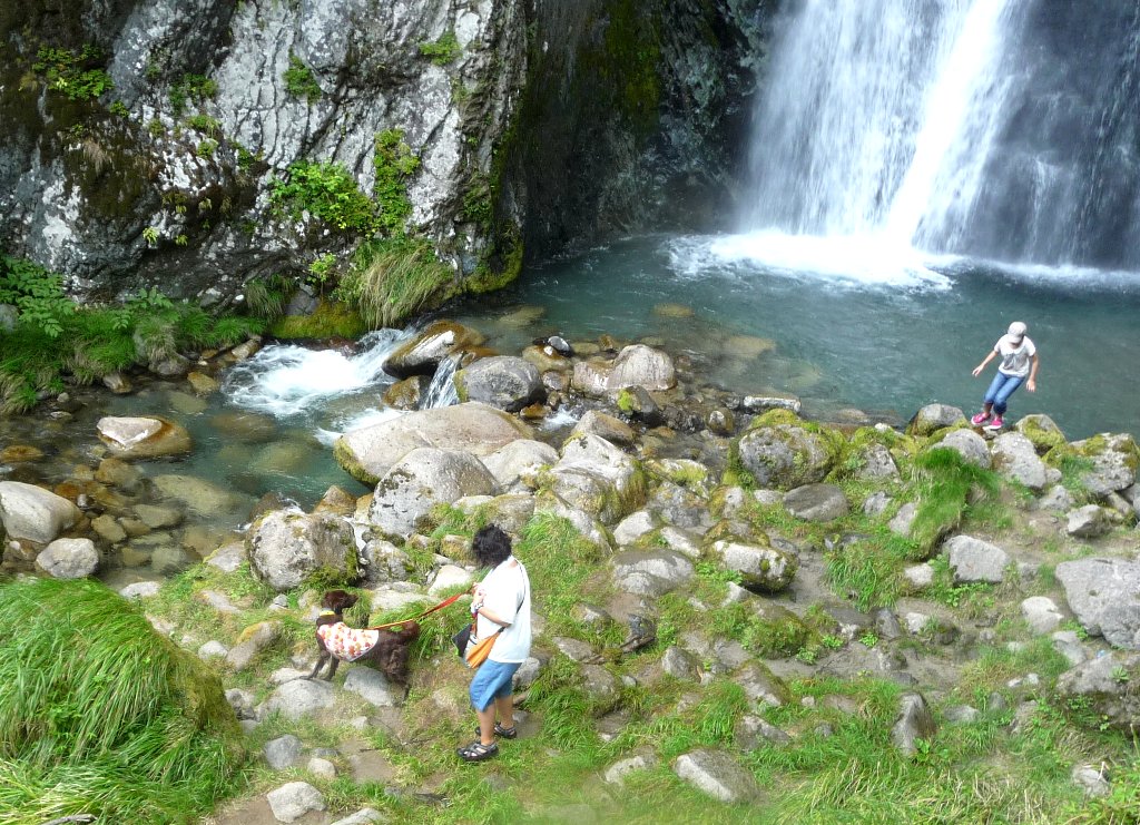 この先が滝を見渡せて人がいっぱいのとこ、で、前方にチワワちゃんかな?年配のおじ様がリードを持ってらっしゃいます。