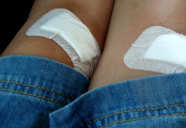 こんな日に限って白いTシャツそしてがうちょうパンツなので転んで膝裂傷、左右の膝と右手の腕を裂傷してリード持ってた左手首はどうもひねったらしくかなり痛い。