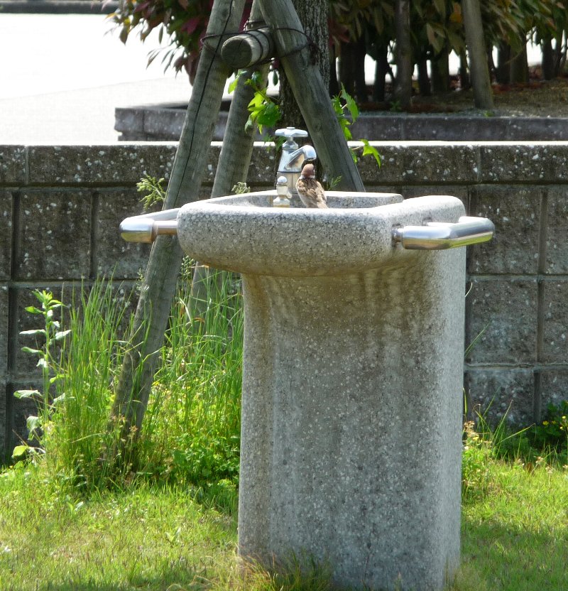この暑さにすずめさんも水浴びしたい?でもそこの水止めてあるはずだよぉ~。