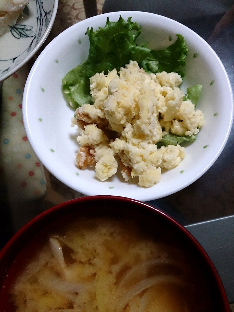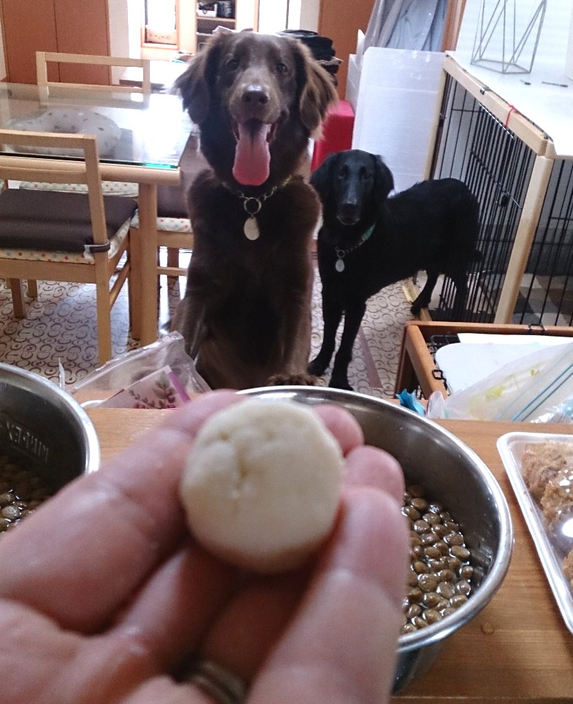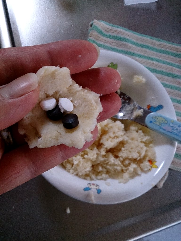 いつもはサツマイモの皮むいて潰しておイモ団子でお薬包んでるんだけど今日はおからに水入れて簡単おから団子♪