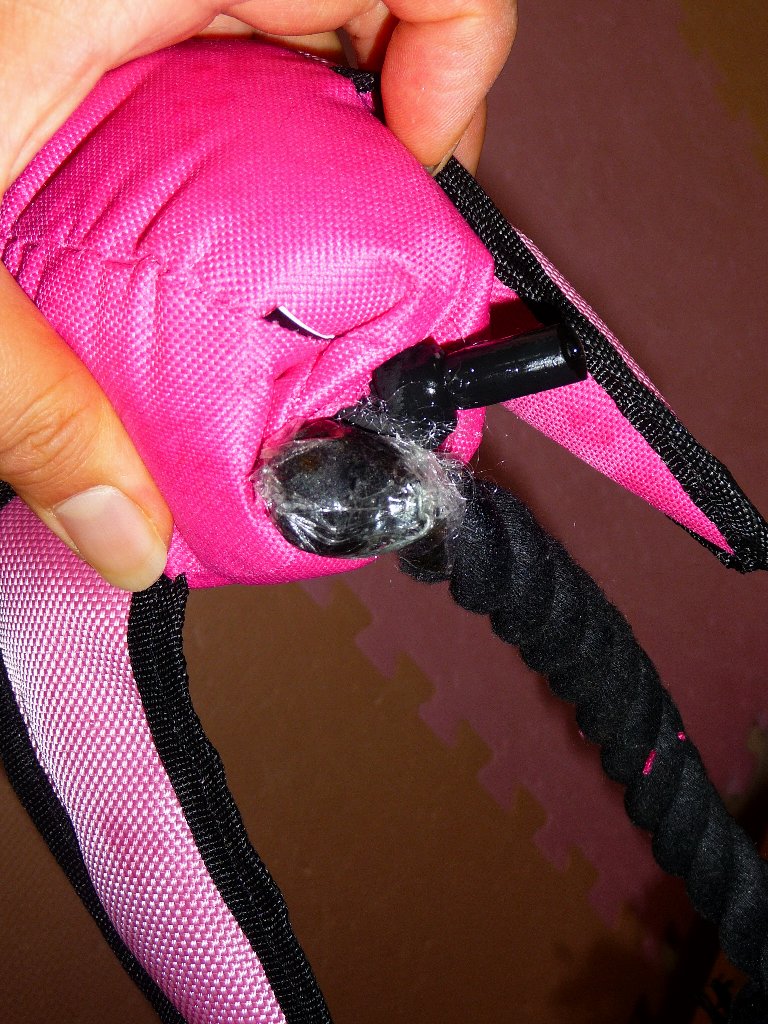 おおっと、ロープとゴムが針金で留めてあるのだ・・・ちと危ないなぁ~・・・と一生懸命押し込んだんだけど本来出てこないようにロープが出ていたところは小さめの穴(それを引っ張り出すってどうよ?)、なもんで押し込んでも入ってかないのよぉ~(´へ` )