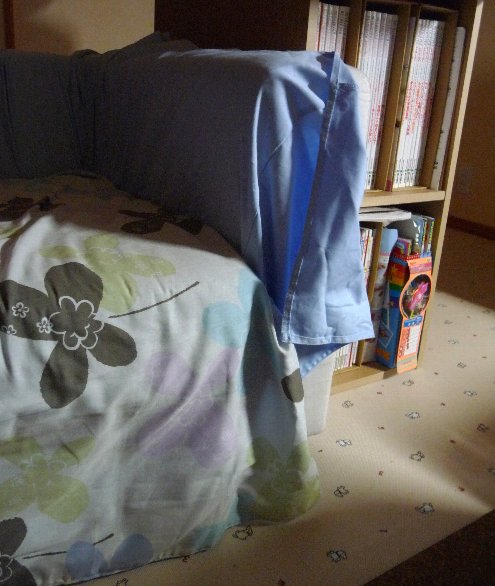 そうそうカヤが正月早々やらかしてくれたソファ、シーツで応急処置(--)b