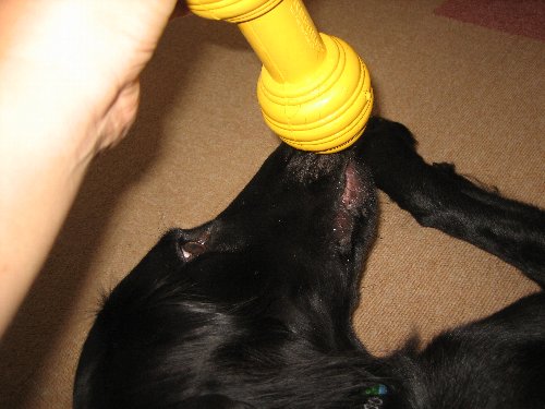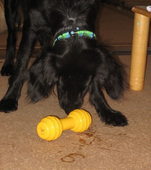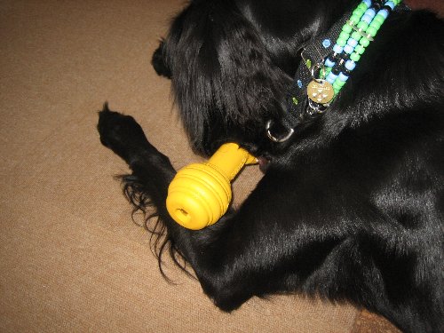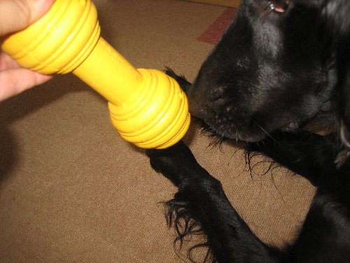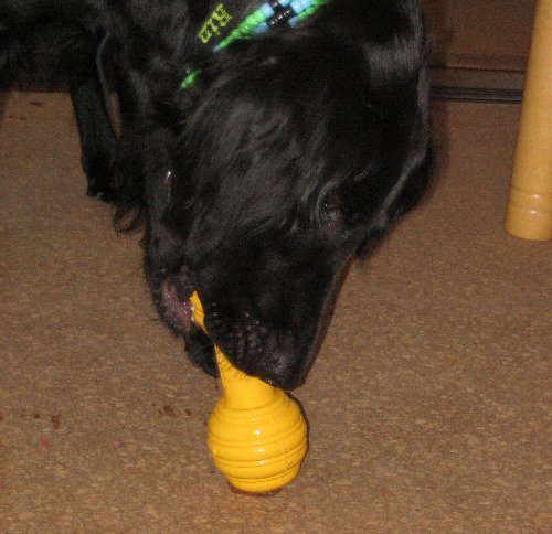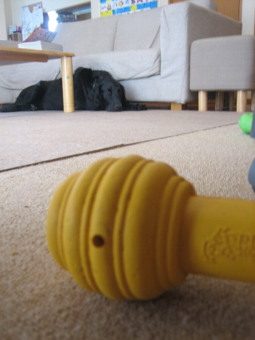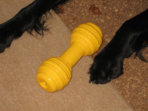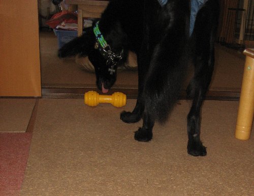 ダンベルの両方の丸いところにトリーツが入るんだけど、これって下を向けて噛まなきゃでないのよねぇ~。