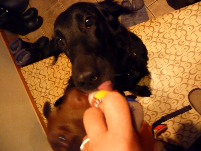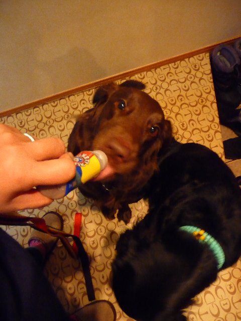 カヤは用心深くにおいチェック、でもよほどいいにおいだったらしくその後はためらいもせずぺろぺろ(^m^)