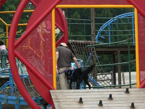 で、今日も遊具にパパと一緒にうひょひょ~いと上って行ったはいいんですが、坂道上ったらコレは無理だろって縄渡り・・・。