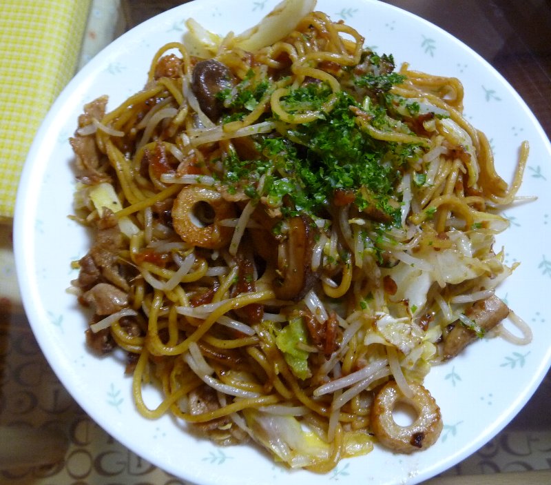 あぁあぁ夕ごはんね、今日はこの間のBBQの残りのヤキソバよん(^^)b