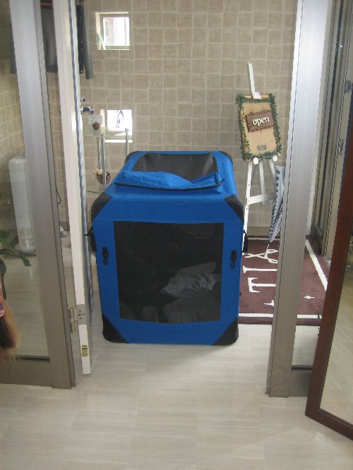 美容院の店長と相談、お客さんはchababaのほかは午前中は1名様、しかもお犬様を飼ってらっしゃる?ってわけで店内にクレートを持ち込んでもいいって話に。