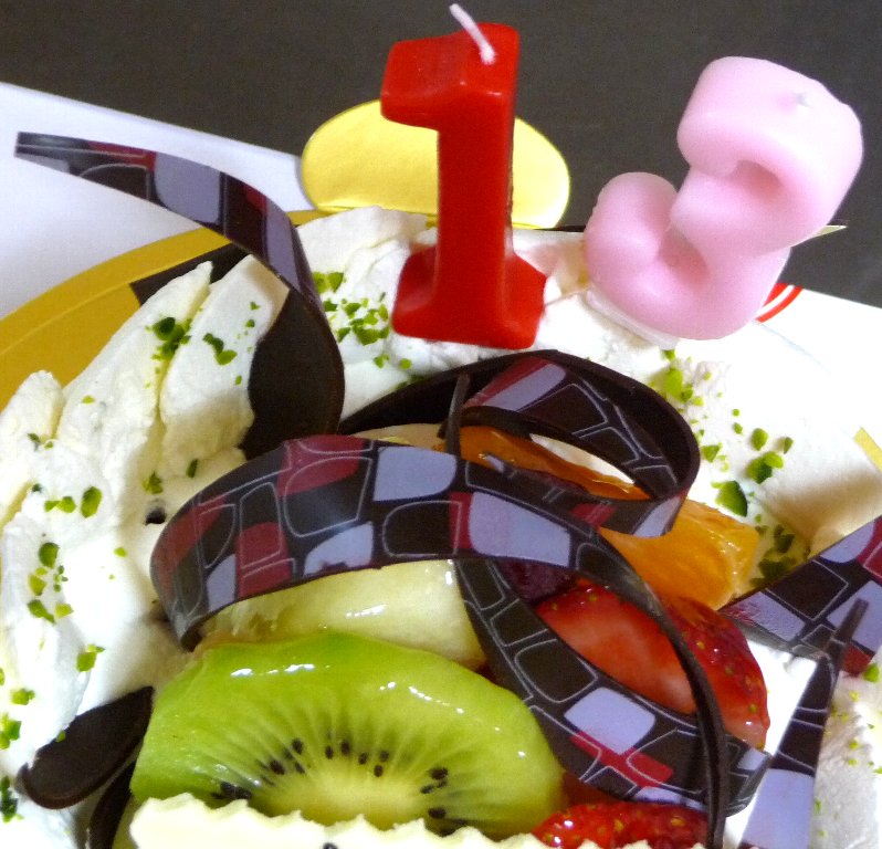 ケーキは今年はスポンジがチョコ生地でフルーツ挟まずナッツを挟んで貰ってスポンジの底はいつものキャラメリゼ、チョコのコーティングだとちょっとくどかったような覚えがあるし今年は生クリームでコートでフルーツをのっけてもらいました。