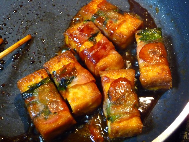 今日までに使わなきゃな厚揚げとベーコンがあったんで厚揚げの紫蘇ベーコン巻とリクエストのほうれん草の胡麻和え、それからお昼のおそばの出汁に豆腐と茗荷と柚子を入れた澄まし汁と冷凍のチキンカツあったからそれと、そして、