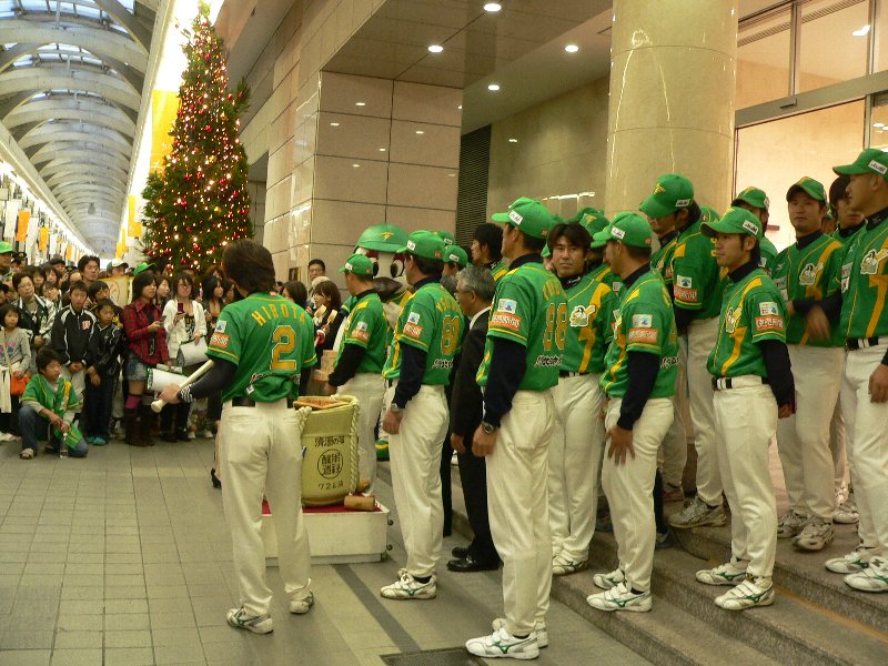 野球の人たちが大和の前でたる酒をバットで割ってなにやらお祝いされてます。