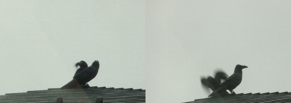 そうそう帰ったら近所のうちの屋根にカラスの番い?一羽は藁みたいなのを咥えてるでしょ、多分出産のための巣作り?
