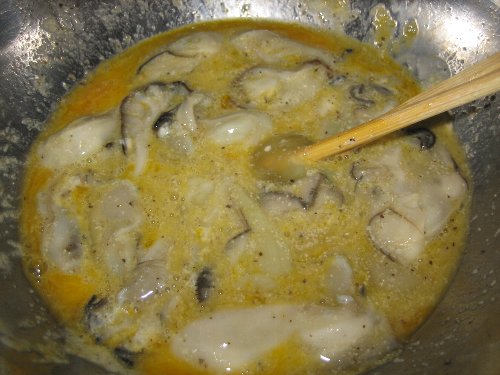 ボールに洗った牡蠣入れて塩コショーしてざざっと混ぜて、そこへ小麦粉を適宜投入、更に卵をぱかっとそのままそこへ割りいれて混ぜ混ぜ混ぜ混ぜ・・・いやぁんらくちぃん♪