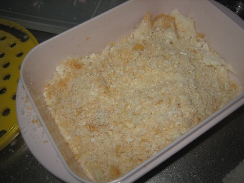 買いに走るかとも思ったけど、この時点ですでに油あっため中・・・冷凍庫を再度見ればこの間パン屋でただでもらってきた切ってないパンの耳が!これだぁ!!と思ってそれを取り出し