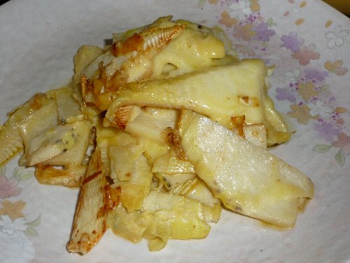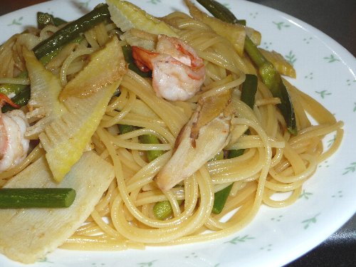 竹の子のチーズ焼きに焼き竹の子の梅昆布茶がけ、それからエビとニンニクの芽と竹の子のパスタ♪