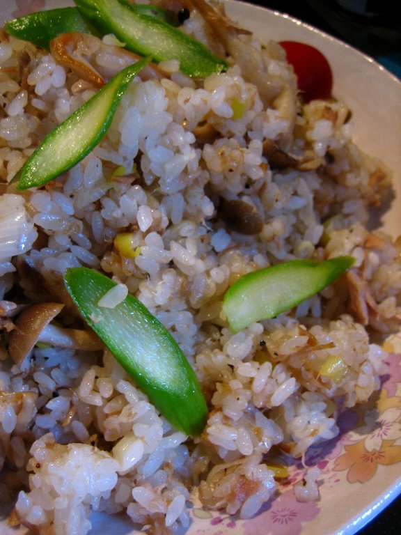 旬のアスパラとしめじ・葱・シーチキンのチャーハンです。