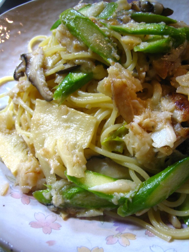 夕飯はご飯を炊いてなかったんで(お弁当作らないとなるとこんなもんです^^;しかも寝坊したし・・・)、今日には食べなきゃいけない銀ダラの味噌漬けがあったんで、たけのこと葱とシイタケ・アスパラでパスタにしてみました♪