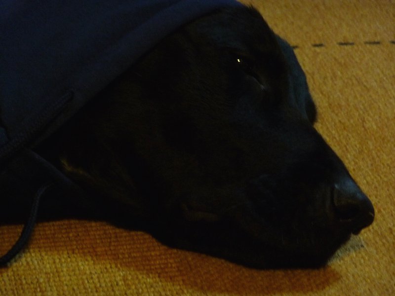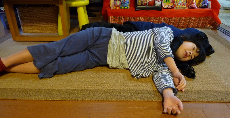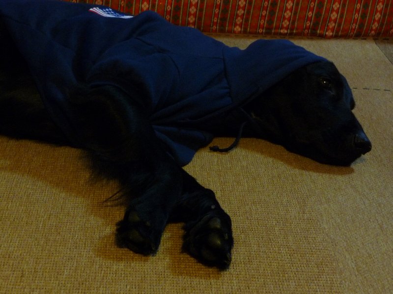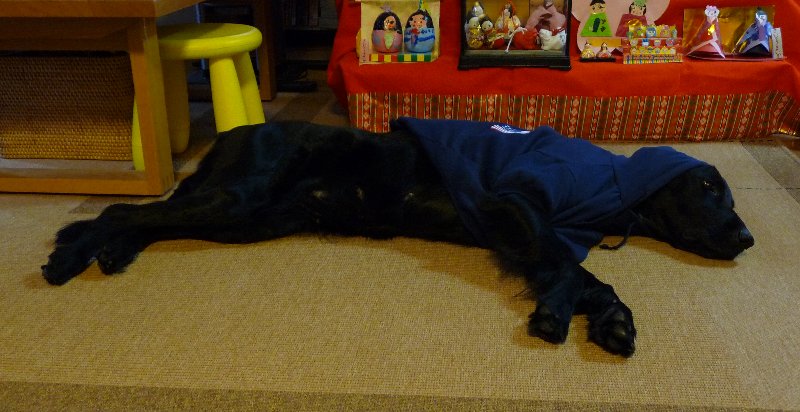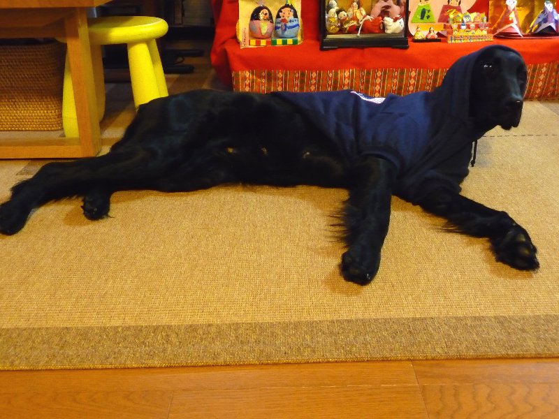 凛パパを送った後カーペットにゴロゴロしているところ・・・トレーナーを持って忍び寄ったchababaに着せられちゃいました(^皿^)
