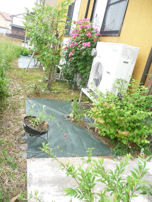 バラの木の下もきれいにしたんで敷いちゃいたかったんだけど、周りのコケははがすべきかこのまま敷いても大丈夫か・・・ちょっと悩んで結局今日はココまで。