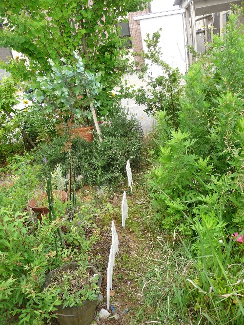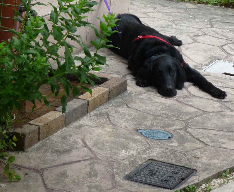 でね、凜には日陰で涼んでもらってハーブたちを植えるついでにおとついの続きで草むしりと防草シート敷き。