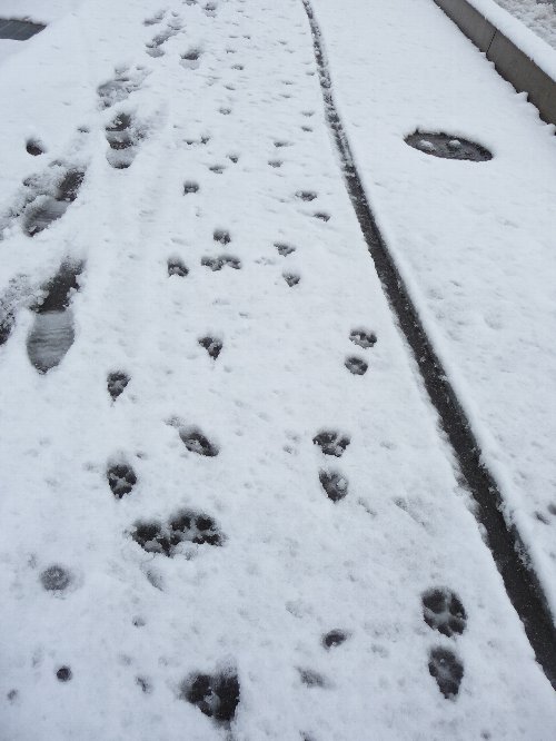 昨日の雪、予報どおりには積もらなかったけどなんだかいろんな足跡がいっぱぁい(^^;)