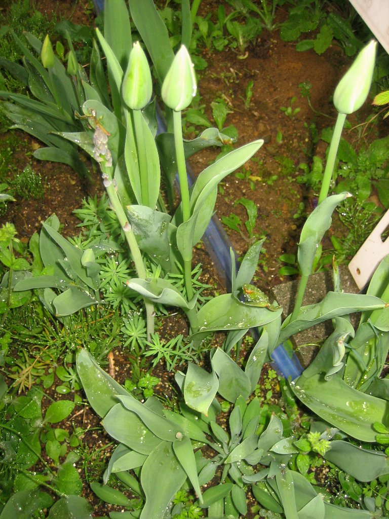チューリップに混じって、確か一昨年植えたアスパラが1本すくすく・・・アスパラって多年だっけ?