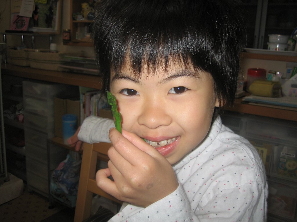 まぁそんなことはどーでもよくって、このながぁ~いアスパラ、でも頭は化けてないアスパラ、姉ちゃんに早く見せなくっちゃ!