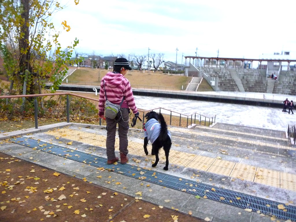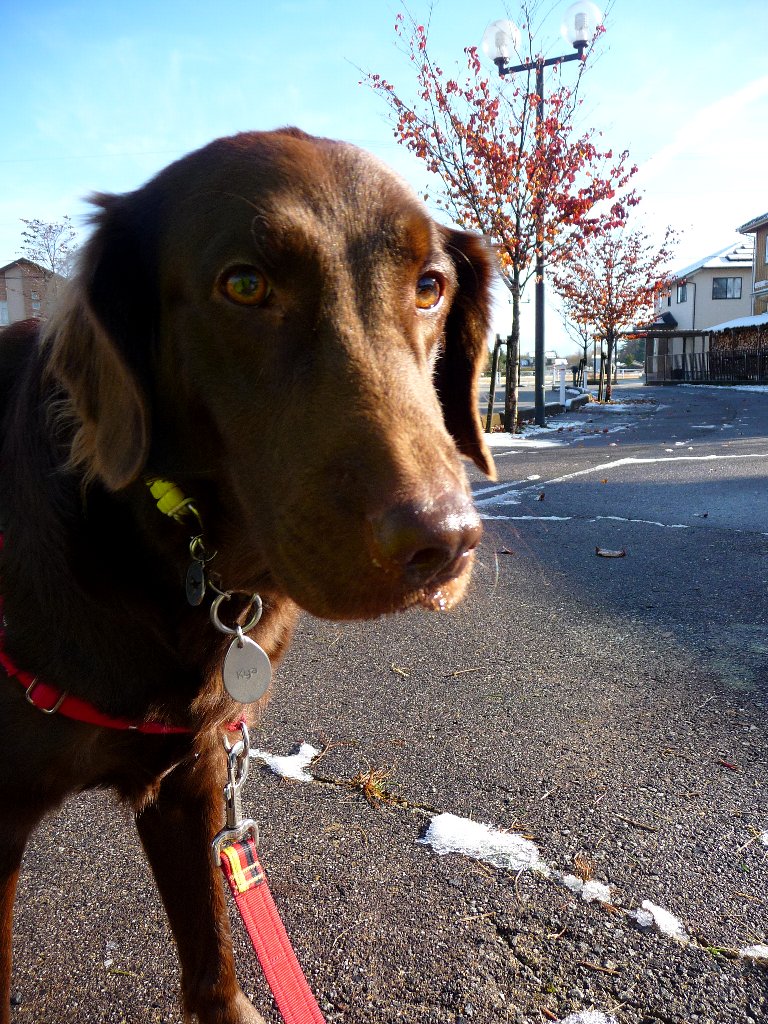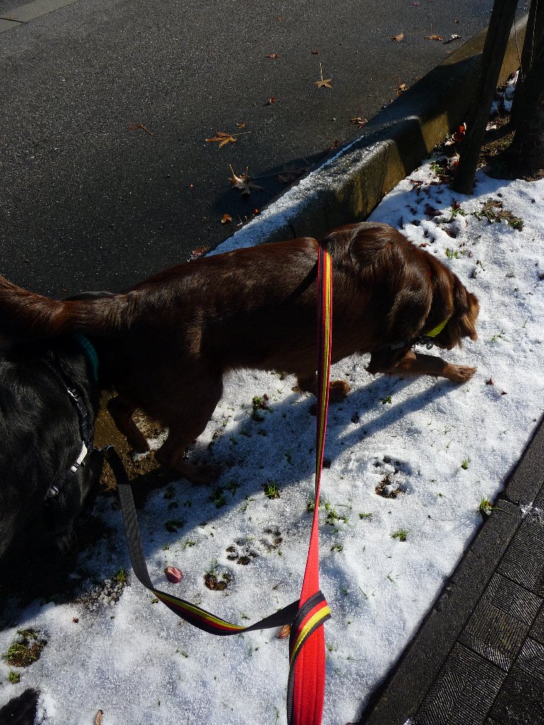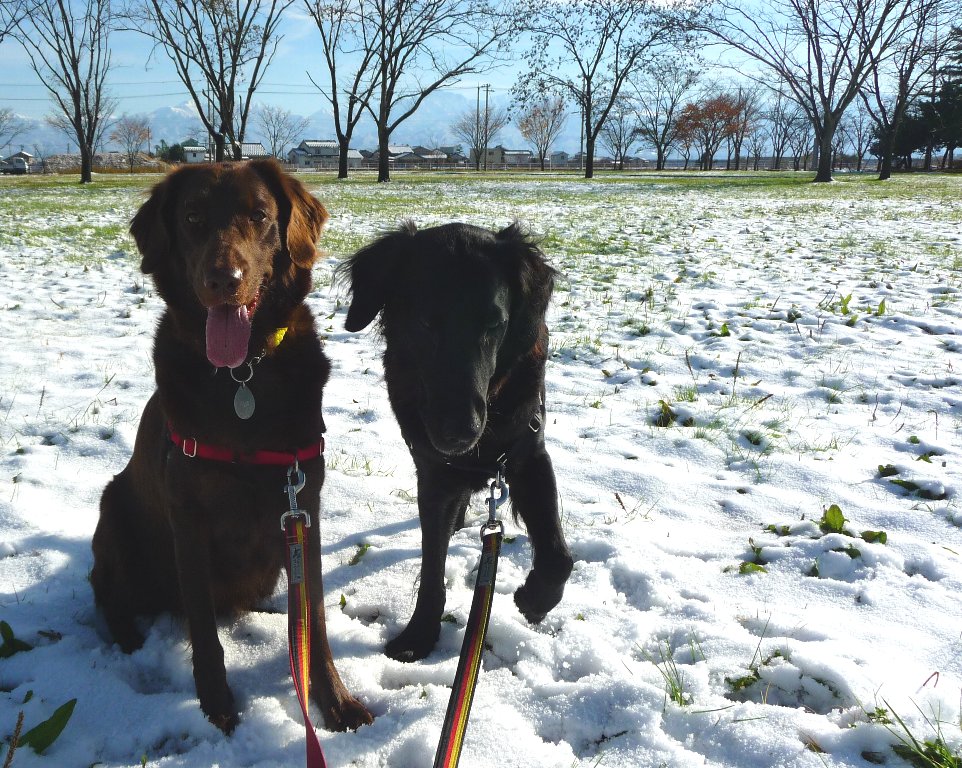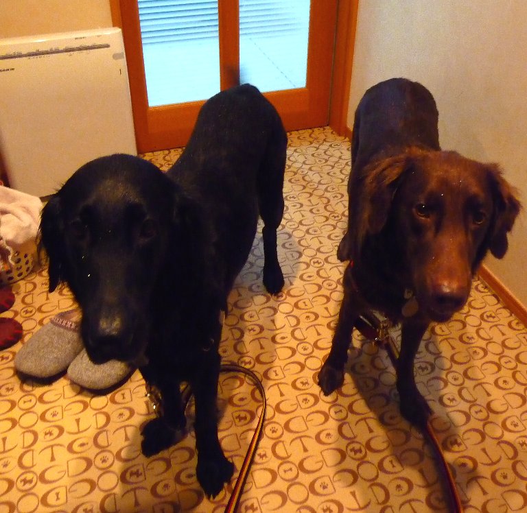 美味しくってルンルンになったのは母だけで、まだまだびちょびちょの雪?が降ってる中のお散歩はテンションの低いお二人さん。