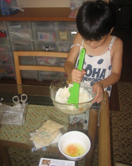 いつもはchababaの手伝いをって感じなんだけど、今日はバターを室温にもどしてやって、卵をお皿に割りいれて、あとは箱の後ろ読んで自分で作ってみ!って。