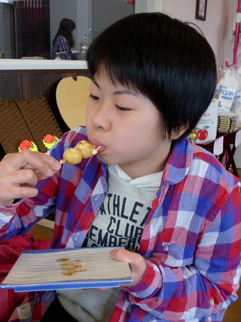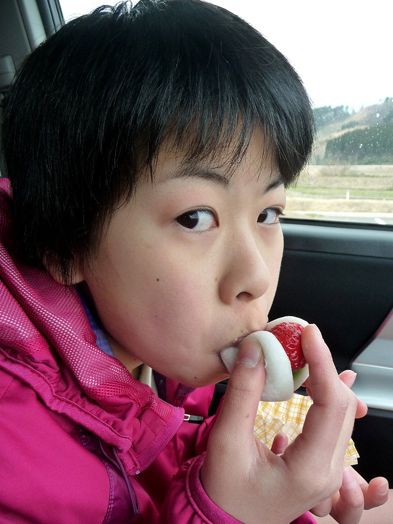 ねえちゃんとchababaは上に上がって飲み物を、とついでにはとやさんの昆布餅とイチゴ大福を購入。