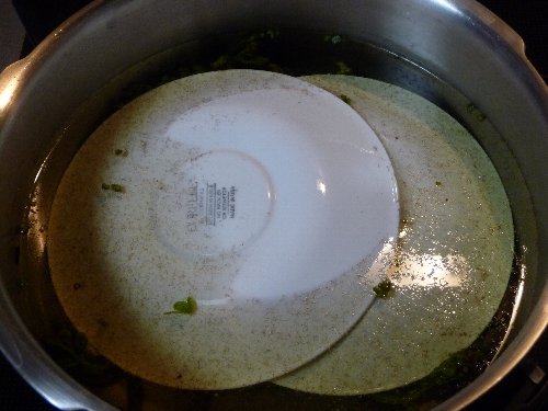 重曹かけて熱湯かけて、重りをして蓋をします。