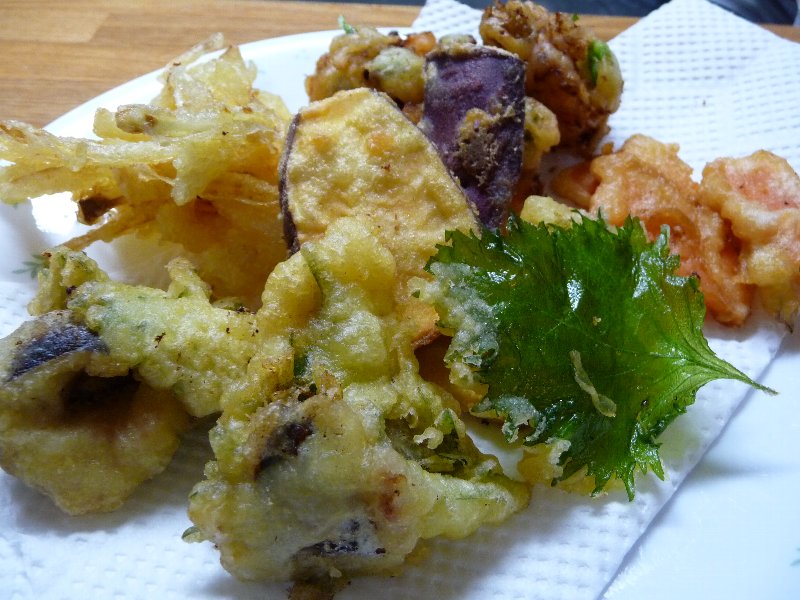 今日のグザイは玉ねぎとイカのかき揚げ、エビと枝豆のかき揚げ? それからイワシに梅抱かせて紫蘇舞いて、後はサツマイモやニンジン、紫蘇!