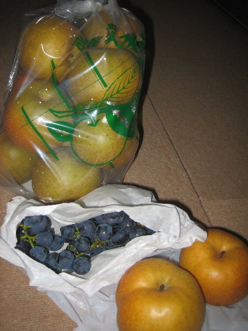 おまけにもらったこの熟れ過ぎた梨2ヶとぶどう、食べてみたけど確かに柔らかめだけどラフランスみたいで美味しかったよん。