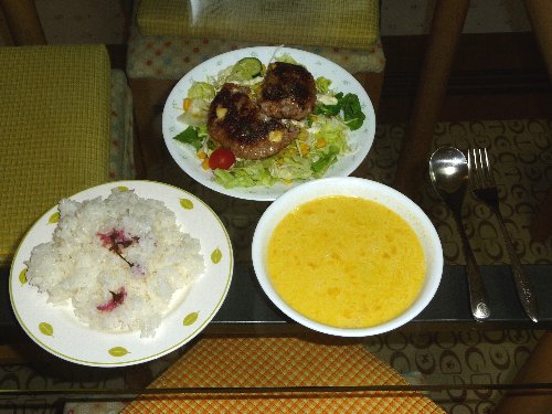 おっきなハンバーグとかぼちゃのポタージュと桜ごはん(^^)やっぱ誰かと食べると美味しいね♪(そう思うと毎日凜パパかわいそう・・・)