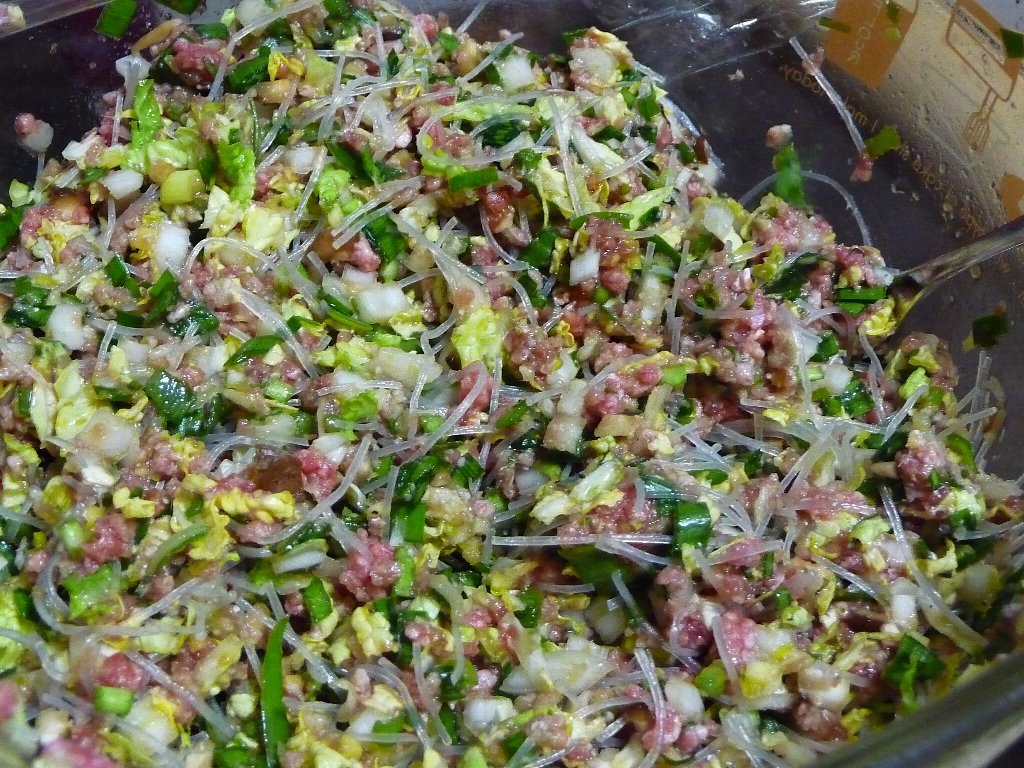 そして翔さんのレシピ以外にシイタケと葱も加えて、お肉と韮と白菜はちょっと減らした上お肉は豚ミンチじゃなくって合挽き(^皿^;)