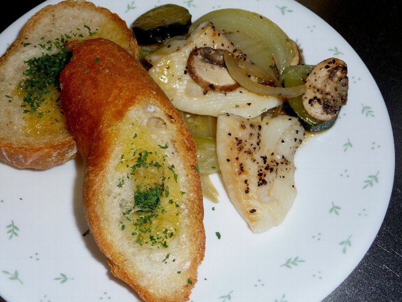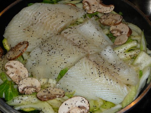 今日の夕ごはんはカレイの切り身が買ってあったんで、セロリと玉ねぎとズッキーニとブラウンマッシュルームをしいて蒸し焼き♪