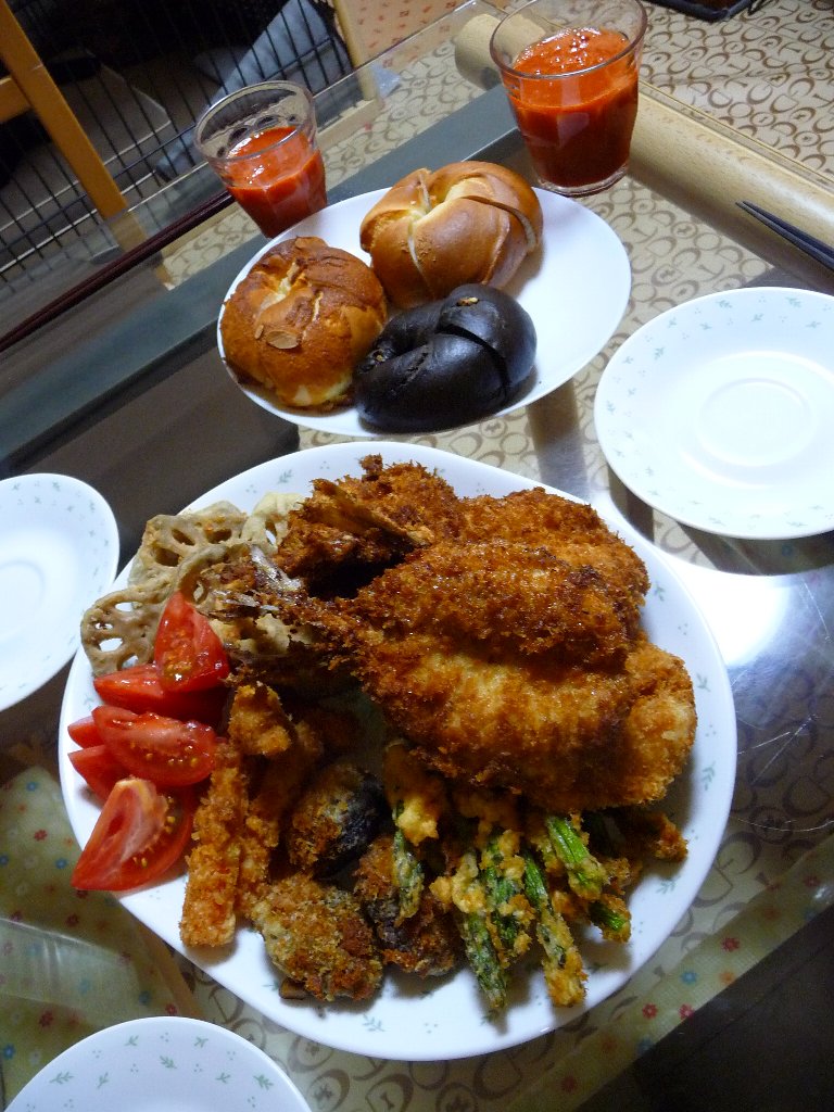 夜ごはんはさっき買って来たベーグルと鯵や野菜のフライで頂きます。