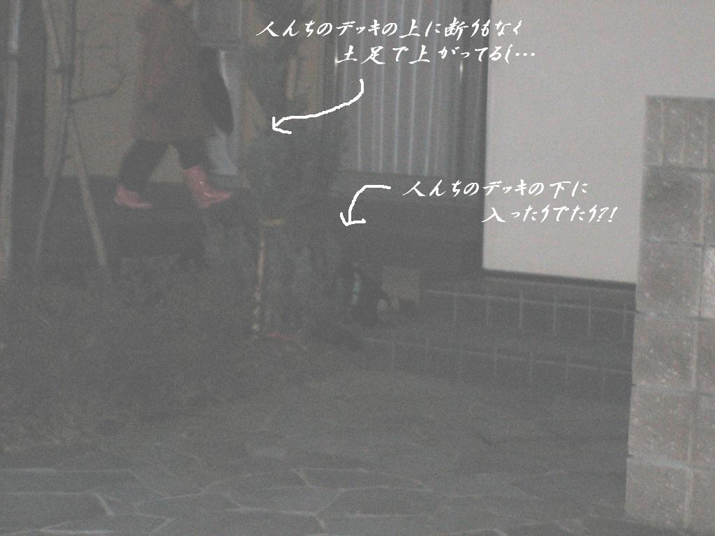 姉ちゃんは姉ちゃんで、自分が放しちゃったんでつかまえなきゃと思ったらしく、長靴のまま勝手にデッキの上に・・・デッキの向こうの窓には電気が・・・中から丸見えだっただろうに、申し訳ないです。