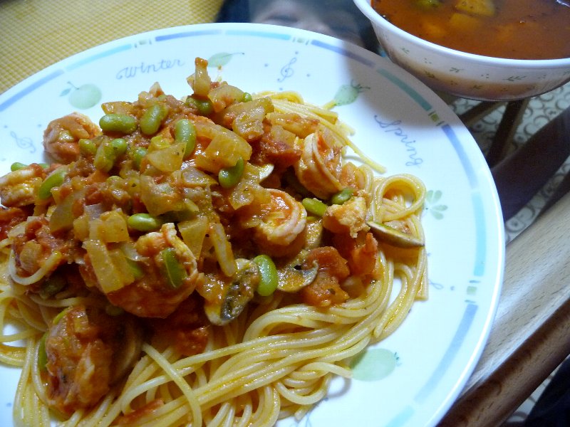 今夜はエビとインゲンマメのパスタにすり身をトマトスープに入れてみたよ。