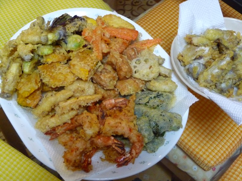 大皿にはレンコン・ピーマン・ニンジン・かぼちゃ・たけのこ・エリンギ・なすびにエビにちくわ、それからサツマイモがたぁんと入っています。