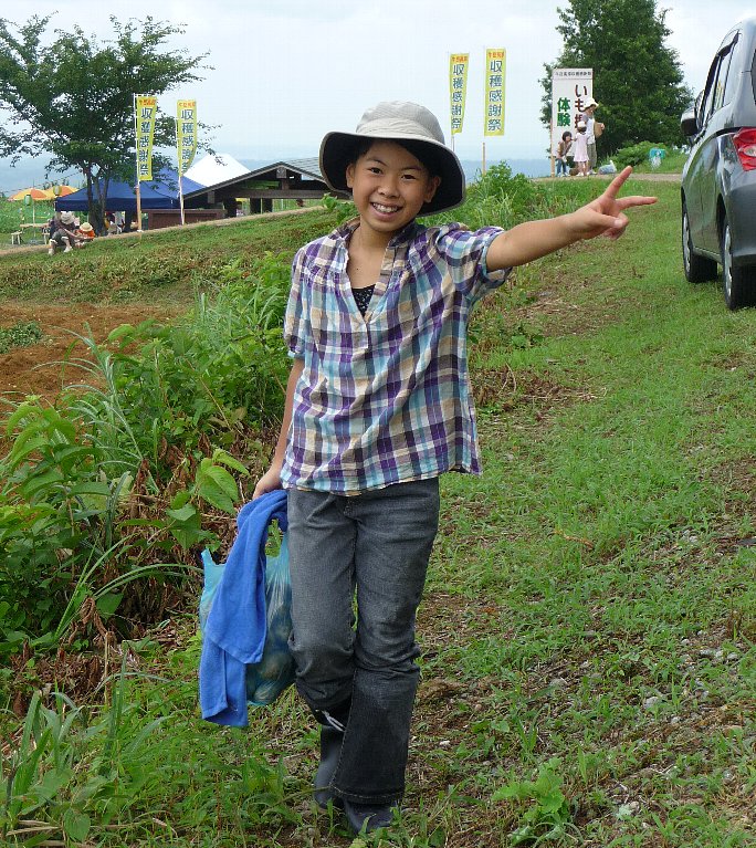 地上部の茎を引っ張ったらぶちぶちぃと根が切れてジャガイモは畑の中に取り残されどこにあるのか掘り返すのが大変、そこで係りのおじさんがスコップを持ってサポート、スコップでちょいとじゃが君たちを持ち上げてそこで茎を引っ張らせれば鈴なりのジャガイモが現れます。